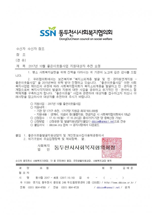 2017년 10월 좋은이웃들사업 지원대상자 추천 요청