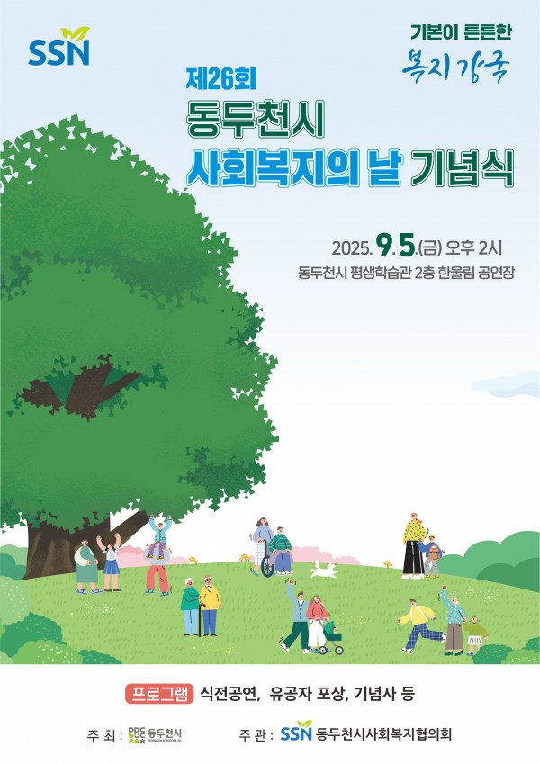 2025년 제26회 사회복지의 날 기념식 안내 페이지 정보 작성자 동두천시사회복지협의회 작성일25-08-14 18:32 조회142회 댓글0건 관련링크 이전글 다음글 목록 본문 2025년 제26회 사회복지의 날 기념식 안내일시 : 2025년 9월 5일(금) 오후2시장소 : 동두천시 평생학습관 2층 한울림 공연장프로그램 : 식전공연, 유공자 포상, 기념사, 경품행사 등 댓글목록 등록된 댓글이 없습니다. 이전글 다음글 목록