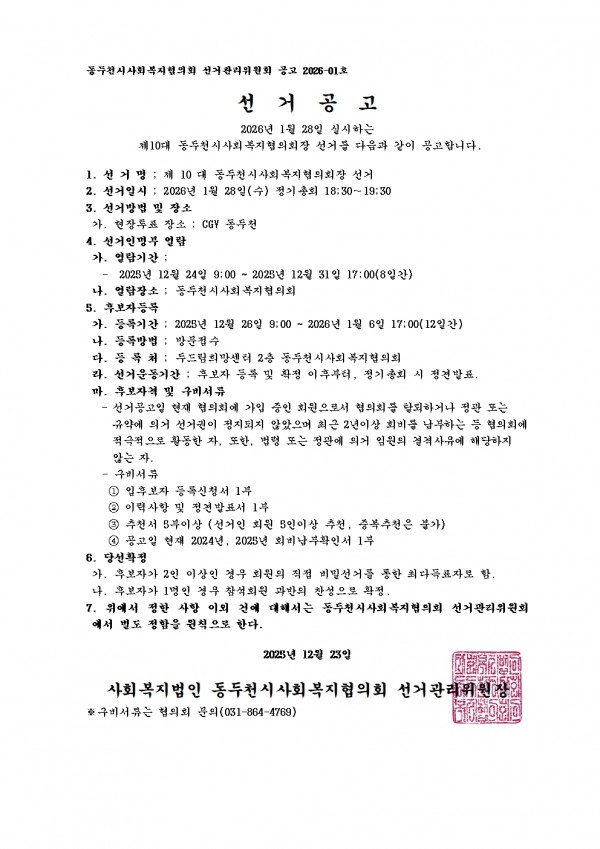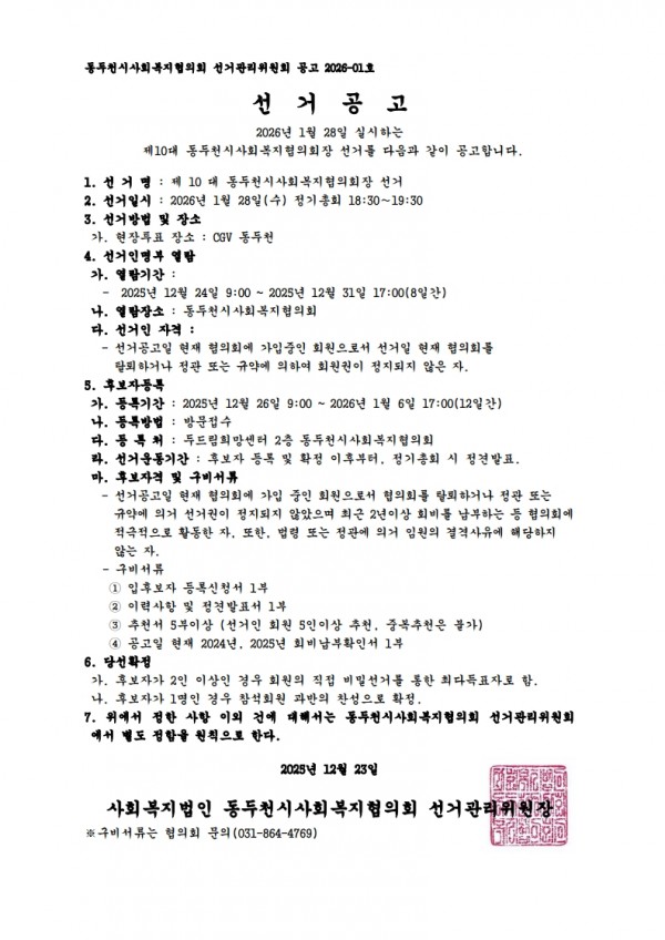 2026년 제10대 동두천시사회복지협의회장 선거 공고