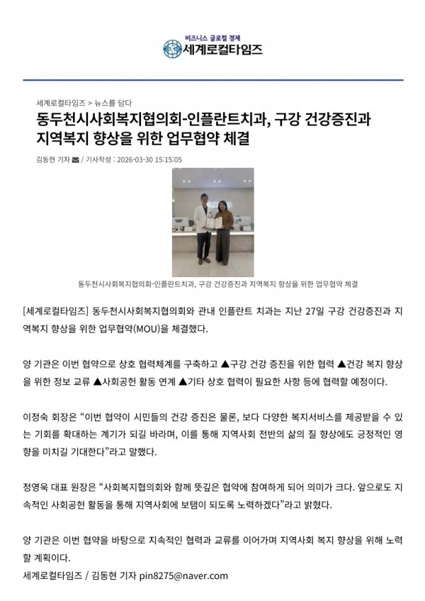 사회복지협의회와 동두천 인플란트치과 구강건강증진과 지역복지향상을 위한 업무협약체결 페이지 정보 작성자 동두천시사회복지협의회 작성일26-03-31 09:38 조회46회 댓글0건 관련링크 다음글 목록 본문 동두천시사회복지협의회-인플란트치과, 구강 건강증진과 지역복지 향상을 위한 업무협약 체결 < 수도권 < 지역뉴스 < 기사본문 - HKBC환경방송 동두천시사회복지협의회-인플란트치과, 구강 건강증진과 지역복지 향상을 위한 업무협약 체결 < 동두천·연천 < 지역뉴스 < 기사본문 - 경기북부탑뉴스 동두천시사회복지협의회-인플란트치과, 구강 건강증진과 지역복지 향상을 위한 업무협약 체결:포스트24 동두천시사회복지협의회-인플란트치과, 구강 건강증진과 지역복지 향상을 위한 업무협약 체결 < 동두천시 < 경기도 < 기사본문 - 경기&뉴스 댓글목록 등록된 댓글이 없습니다. 다음글 목록