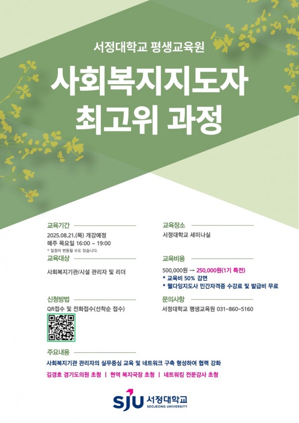 사회복지지도자 최고위 과정_서정대학교 평생교육원 페이지 정보 작성자 동두천시사회복지협의회 작성일25-05-30 12:16 조회132회 댓글0건 관련링크 다음글 목록 본문 댓글목록 등록된 댓글이 없습니다. 다음글 목록