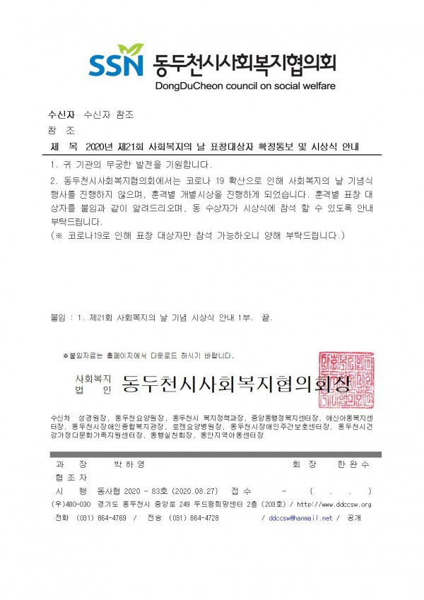 2020년 제21회 사회복지의 날 표창대상자 확정통보 및 시상식 안내