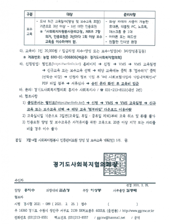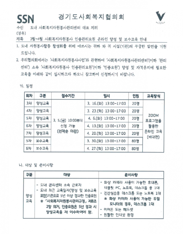3월~4월 사회복지자원봉사 인증관리요원 온라인 양성 및 보수교육 안내 페이지 정보 작성자 동두천시사회복지협의회 작성일21-02-25 16:45 조회2,019회 댓글0건 관련링크 이전글 다음글 목록 본문 3월~4월 사회복지자원봉사 인증관리요원 온라인 양성 및 보수교육 안내해드립니다. 댓글목록 등록된 댓글이 없습니다. 이전글 다음글 목록