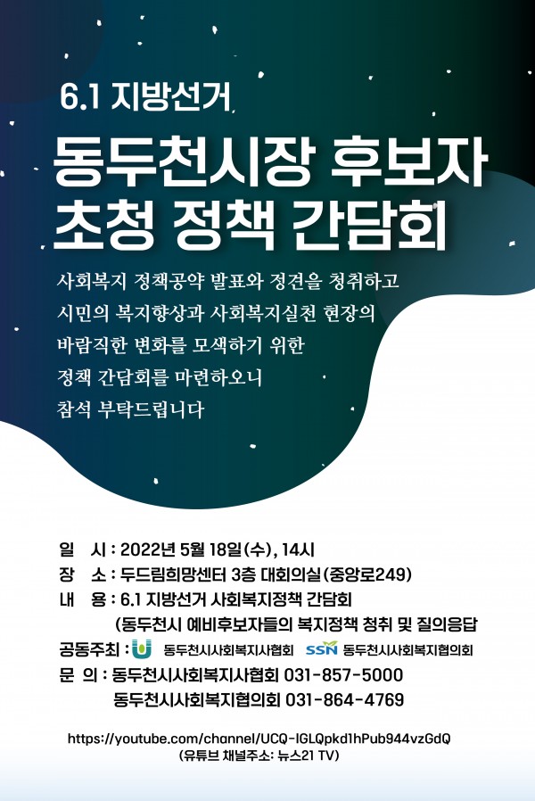 동사협에서는 위와 같이 동두천시사회복지협의회와 공동주최로 시장 후보자 초청 정책간담회를 다음과 같이 진행하오니 회원님들의 많은 참여와 관심 부탁드리겠습니다.