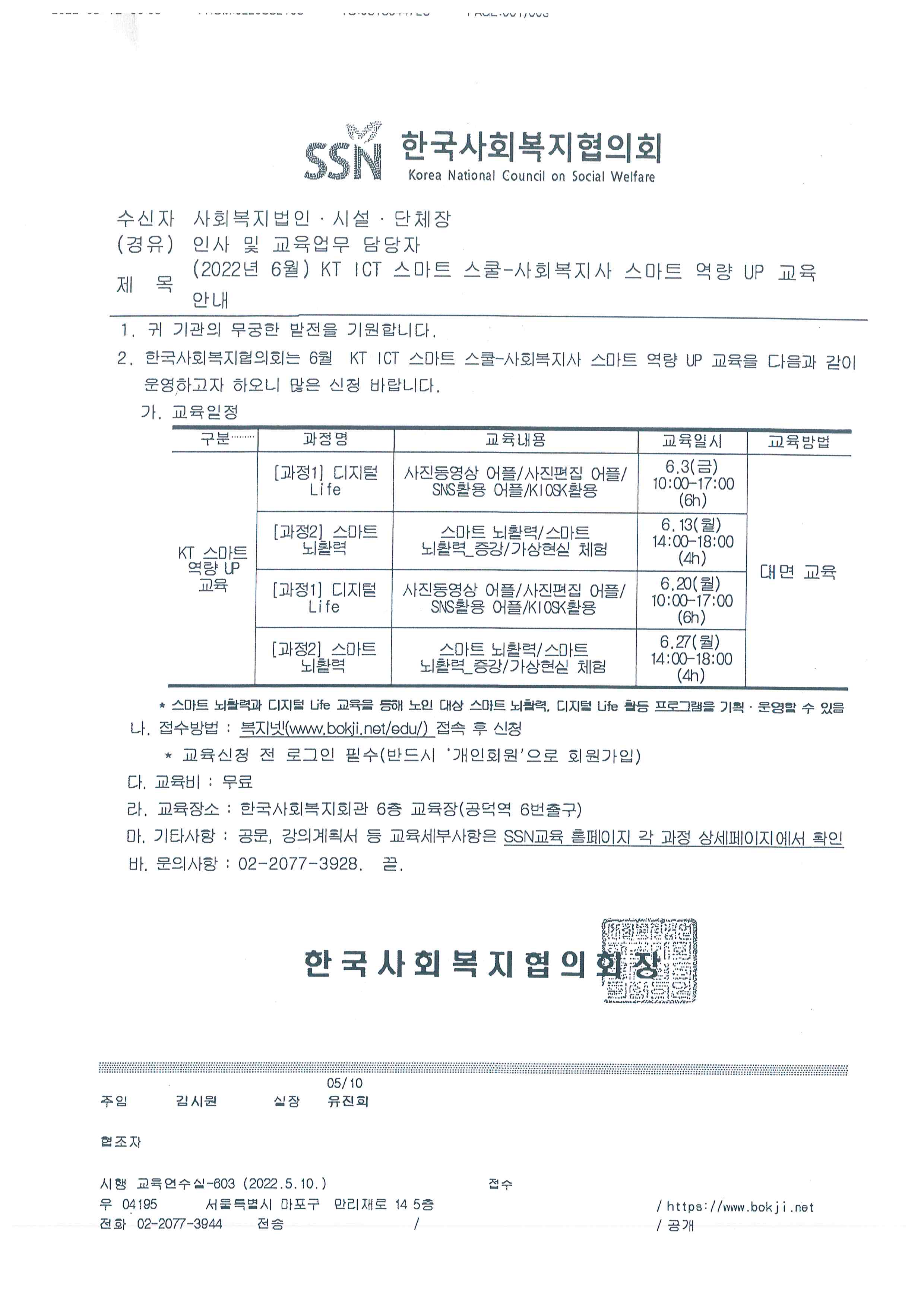 (2022년 6월) KT ICT 스마트 스쿨-사회복지사 스마트 역량 UP 교육 안내 페이지 정보 작성자 동두천시사회복지협의회 작성일22-05-16 15:20 조회984회 댓글0건 관련링크 이전글 다음글 목록 본문 댓글목록 등록된 댓글이 없습니다. 이전글 다음글 목록