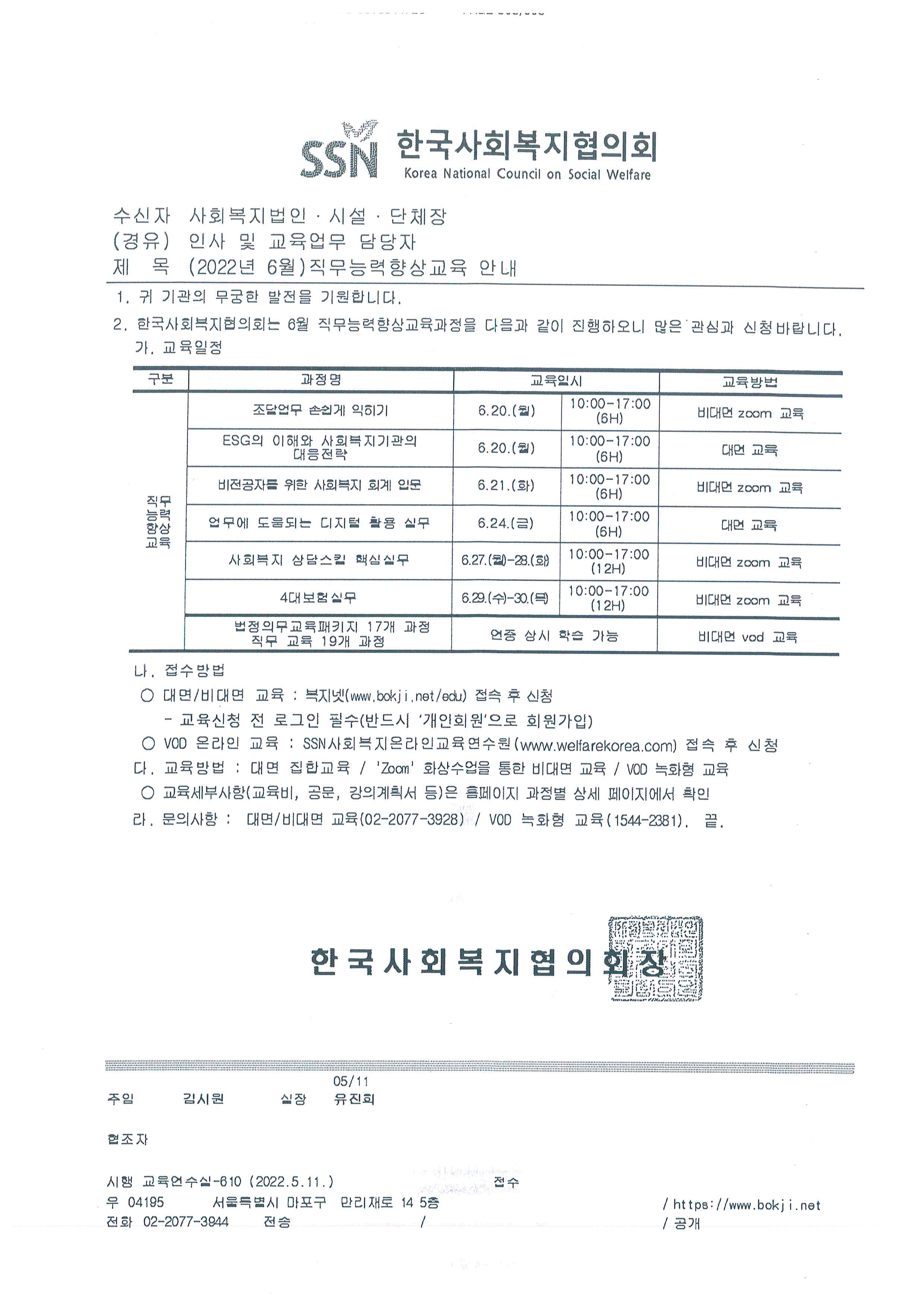 (2022년 6월) 직무능력향상교육 안내 페이지 정보 작성자 동두천시사회복지협의회 작성일22-05-16 15:21 조회941회 댓글0건 관련링크 이전글 다음글 목록 본문 댓글목록 등록된 댓글이 없습니다. 이전글 다음글 목록