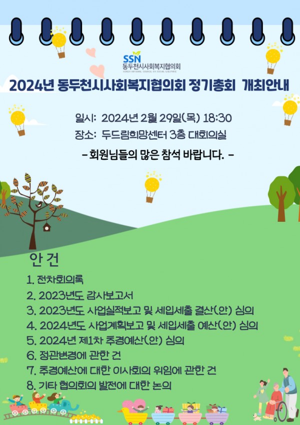 2024년 총회 공고 이미지 첨부합니다. 페이지 정보 작성자 동두천시사회복지협의회 작성일24-02-22 12:21 조회729회 댓글0건 관련링크 이전글 다음글 목록 본문 총회안내드립니다.^^ 댓글목록 등록된 댓글이 없습니다. 이전글 다음글 목록