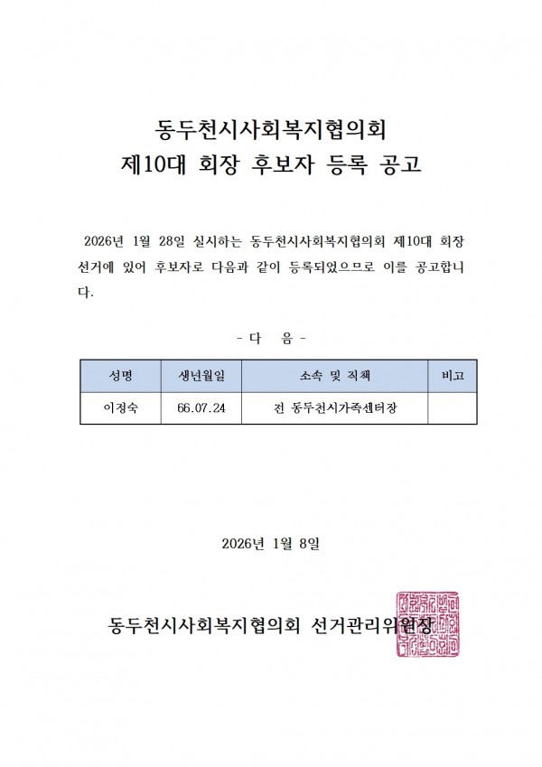2026년 동두천시사회복지협의회 제10대 회장 후보자 등록 공고 페이지 정보 작성자 동두천시사회복지협의회 작성일26-01-08 16:09 조회26회 댓글0건 관련링크 다음글 목록 본문 . 댓글목록 등록된 댓글이 없습니다. 다음글 목록