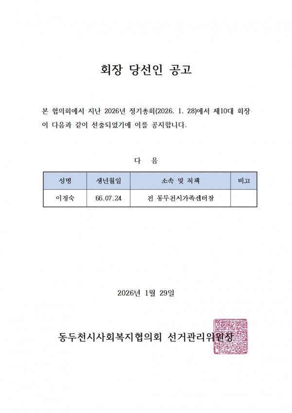 제10대 동두천시사회복지협의회장 당선인 공고 페이지 정보 작성자 동두천시사회복지협의회 작성일26-01-29 11:19 조회92회 댓글0건 관련링크 이전글 다음글 목록 본문 . 댓글목록 등록된 댓글이 없습니다. 이전글 다음글 목록