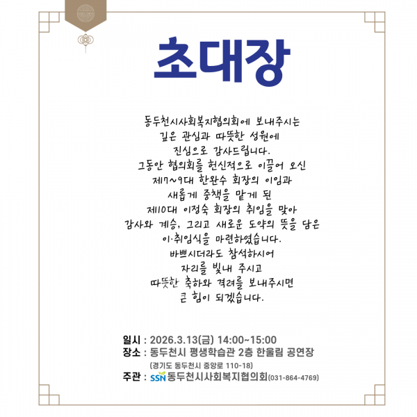 병오년(丙午年)을 맞이하여 동두천시 사회복지 발전을 위한 화합과 새로운 다짐의 장으로 2026년 동두천시 사회복지계 신년인사회 및 동두천시사회복지협의회장 이·취임식을 개최하오니 참석하시어 자리를 빛내주시기 바랍니다.