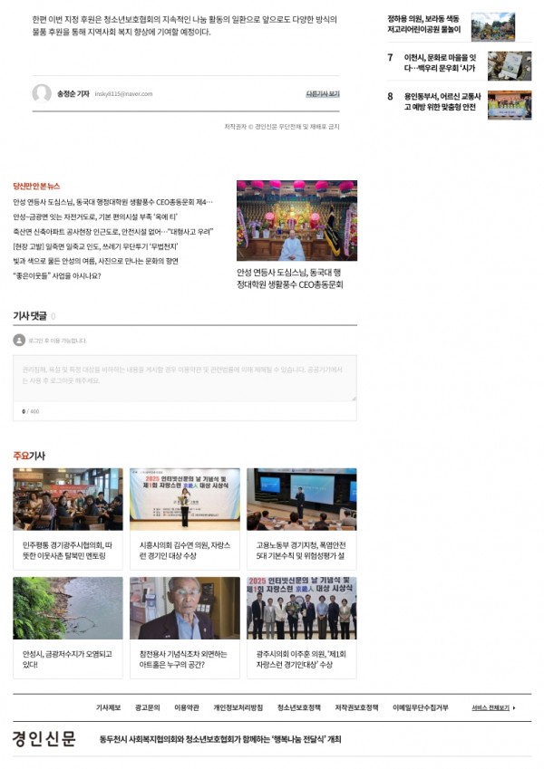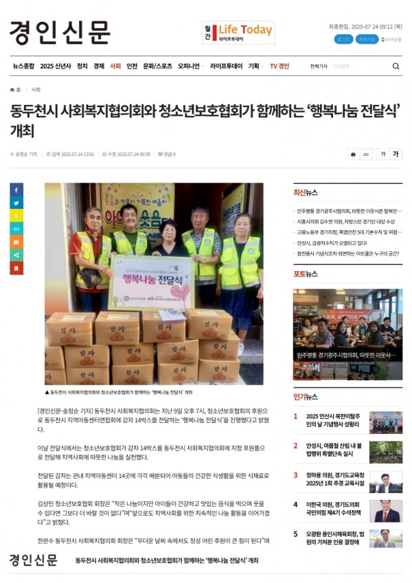 동두천시사회복지협의회와 청소년보호협회가 함께하는 '행복나눔 전달식'개최 페이지 정보 작성자 동두천시사회복지협의회 작성일25-07-24 09:56 조회132회 댓글0건 관련링크 이전글 다음글 목록 본문 동두천시사회복지협의회와 청소년보호협회가 함께하는 '행복나눔 전달식'개최https://www.asn24.com/news/articleView.html?idxno=457745 댓글목록 등록된 댓글이 없습니다. 이전글 다음글 목록